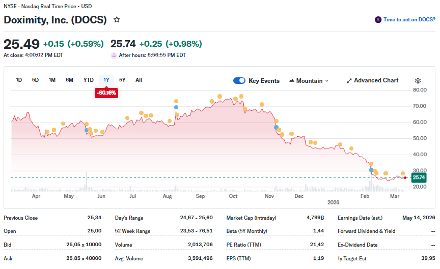 DOCS 1년 주가 흐름_Yahoo Finance(출처)