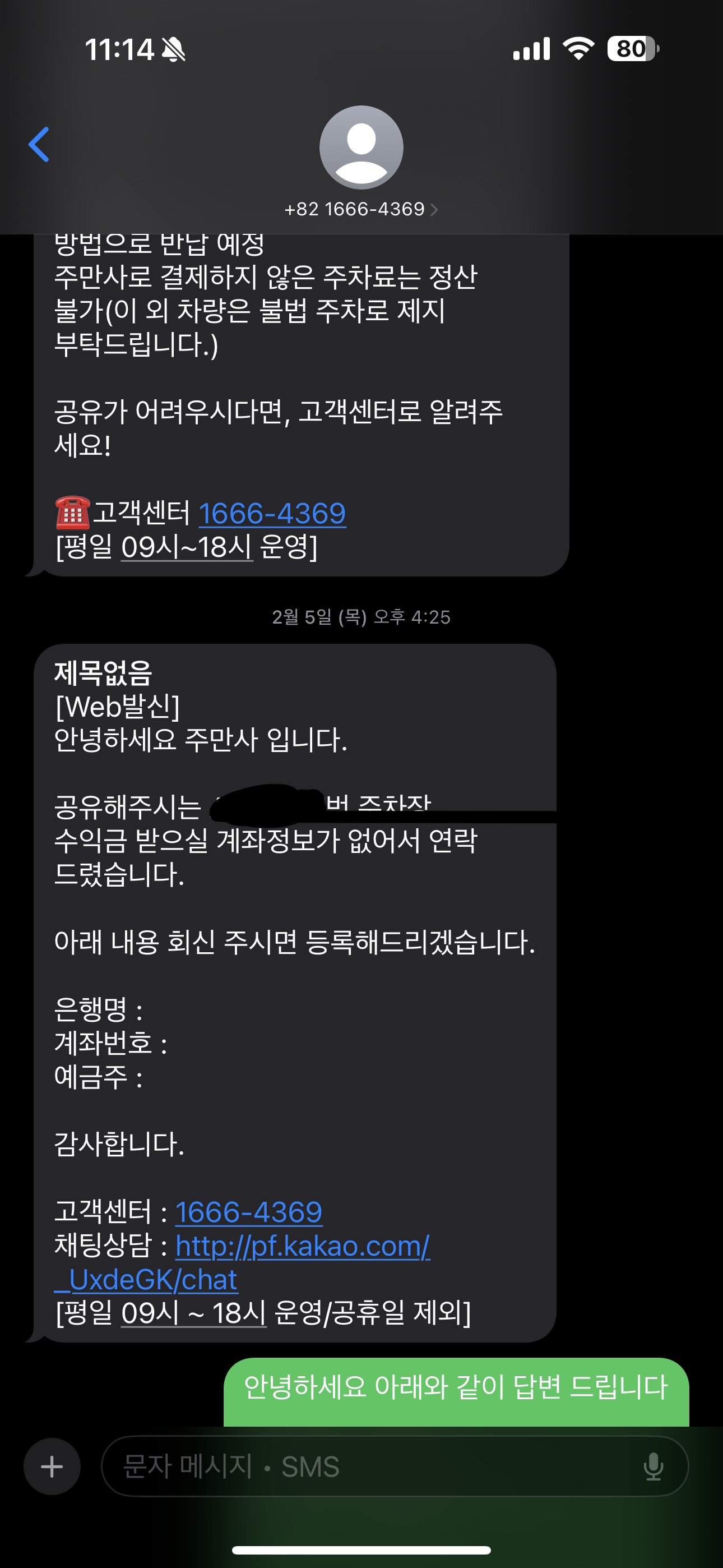- 단점 : 주차장 이용 하시는 분들 입장에서는 괜찮을 수 있지만, 주차장 공유를 하는 사람 입장에서는 어플 사용법이 매우 불편합니다. 어플 어디에서도 수익금 정산 받을 계좌번호를 등록할 수 있는 곳을 찾을 수가 없었습니다 (물론 제가 못 찾았을 수는 있습니다만). 일단 은행계좌를 연결해두었는데, 연락이 왔던 걸 보면 수익금 정산받는 계좌를 입력한 게 아닌 것 같습니다. 그래서, 처음에는 포인트로 정산을 받고 포인트를 다시 현금으로 바꾸는 방식인가?라고 고민했었습니다. 또, 영업시간에 전화 받기 어려운 직종에 있거나 전화 통화가 불편한 분들은 주만사 어플이 편하지 않을 수 있을 것 같습니다.
